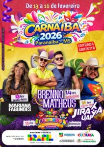 A Prefeitura de Paranaíba, por meio das Secretarias Municipais de Cultura, Governo e Turismo, em parceria com o Ministério do Turismo, divulga a programação do Carnaíba 2026. A programação do Carnaval começa no dia 13 de fevereiro, com show de Mariana Fagundes,