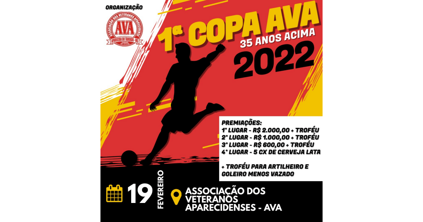 Aparecida do Taboado (MS) – Terá início neste sábado (19) a partir das 16h30 (br) a 1ª Copa AVA destinada para maiores de 35 anos. Serão 8 equipes competindo pelas premiações, sendo a maior de R$ 2 mil, além do troféu.