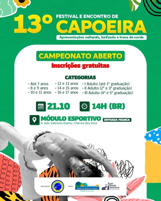 Vem aí o 13º Festival e Encontro de Capoeira, um evento tradicional em Aparecida do Taboado. Este ano, o encontro promete mais energia e cultura para o dia 21 de outubro de 2023, às 14h, no Módulo Esportivo “Wilfrides Alves Martins”.