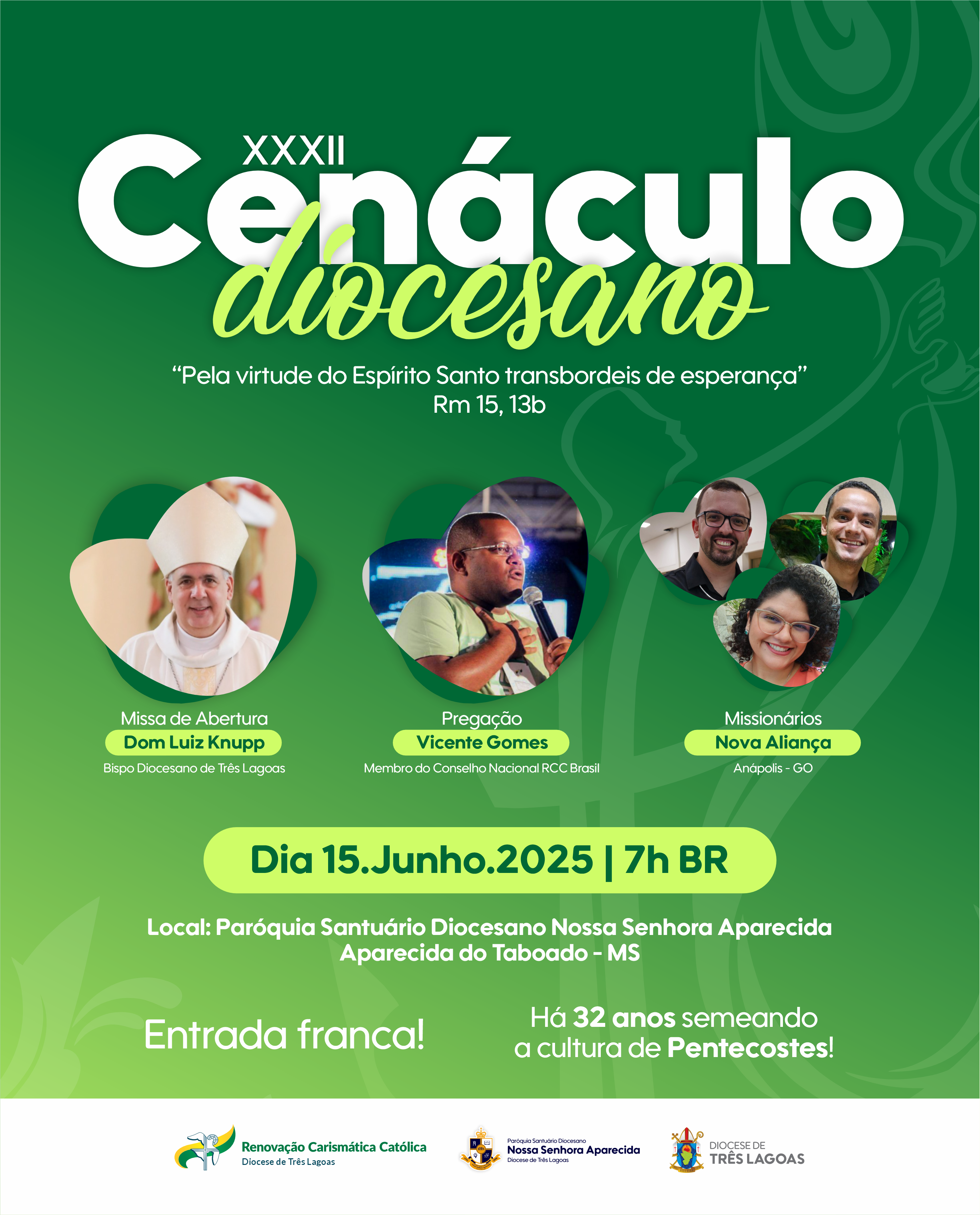 “O Cenáculo Diocesano 2025 será um dia de escuta, unidade e muita graça derramada sobre a nossa Diocese. Um tempo para nos deixarmos conduzir pelo Espírito Santo e renovar o fogo da missão em nossos corações. Prepare seu coração, convide seu grupo de oração, traga sua família e venha viver esse momento especial com a gente”, convida a coordenadora da RCC de Aparecida do Taboado, Claudinea Aparecida Vaz dos Santos Monteiro.