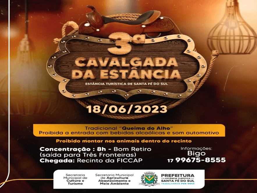 Como parte das festividades em comemoração aos 75 anos da Estância Turística de Santa Fé do Sul, o governo municipal realizará no domingo, 18 de junho, a 3ª Cavalgada da Estância. A concentração dos participantes será às 7h30, na Avenida Conselheiro Antônio Prado, em frente ao Supermercado Bom Retiro, saída para Três Fronteiras. O desfile seguirá pela Avenida Conselheiro Antônio Prado até o cruzamento com a Avenida Navarro de Andrade, seguindo pela avenida até o Recinto de Exposições Dr. Rodolfo Abdo.