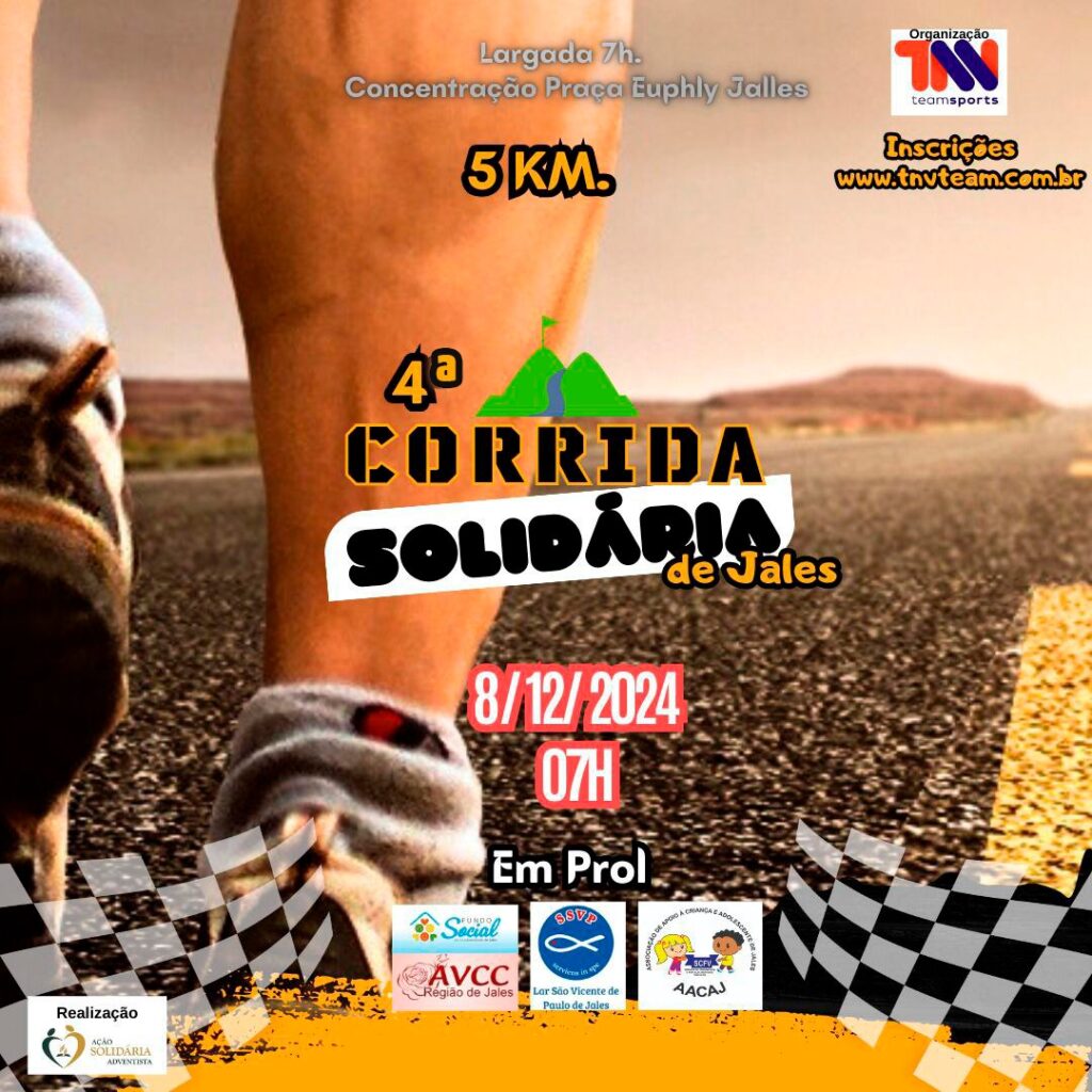 A 4ª Corrida Solidária, realizada anualmente pela Ação Solidária Adventista do Sétimo Dia de Jales (ASA), mais uma vez, promete unir esporte e solidariedade. O evento esse ano contará com o apoio e organização da TNV Team Sports e será realizado no dia 08 de dezembro (domingo), às 7h, na Praça Dr. Euphly Jalles.