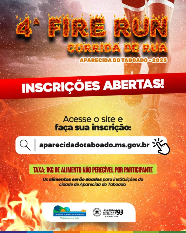 A cidade de Aparecida do Taboado (MS) sediará, no dia 6 de julho, a 4ª edição da Fire Run — corrida de rua em homenagem ao Dia do Bombeiro Militar. O evento terá largada às 7h (MS).