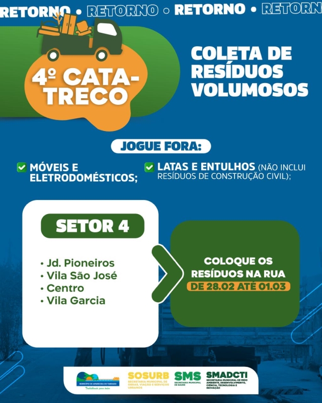 A Prefeitura está realizando a 4ª edição do Cata-Treco, iniciativa que incentiva o descarte correto de resíduos volumosos e contribui para manter a cidade mais limpa e organizada.