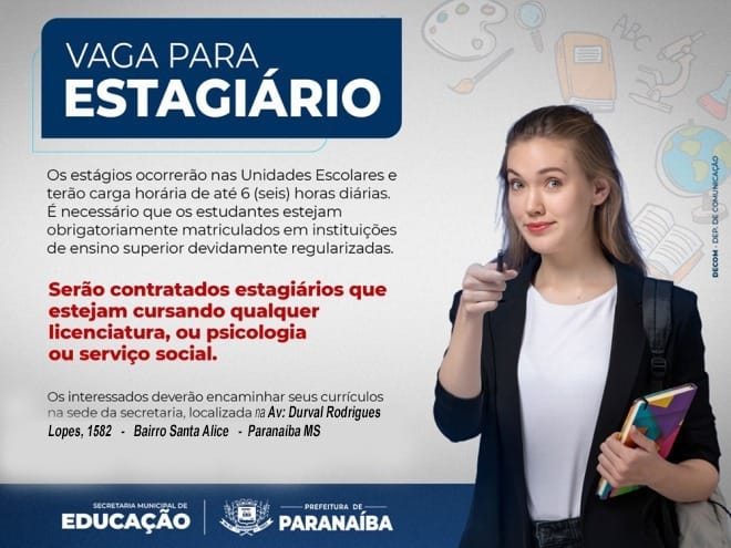 A Prefeitura de Paranaíba, por meio da Secretaria Municipal de Educação, irá contratar estagiários que estejam nos cursos de Licenciatura, Psicologia ou Serviço Social. Os interessados deverão encaminhar seus currículos na sede da secretaria, localizada na Avenida Durval Rodrigues Lopes, 1582, Santa Alice, das 7h às 13h.