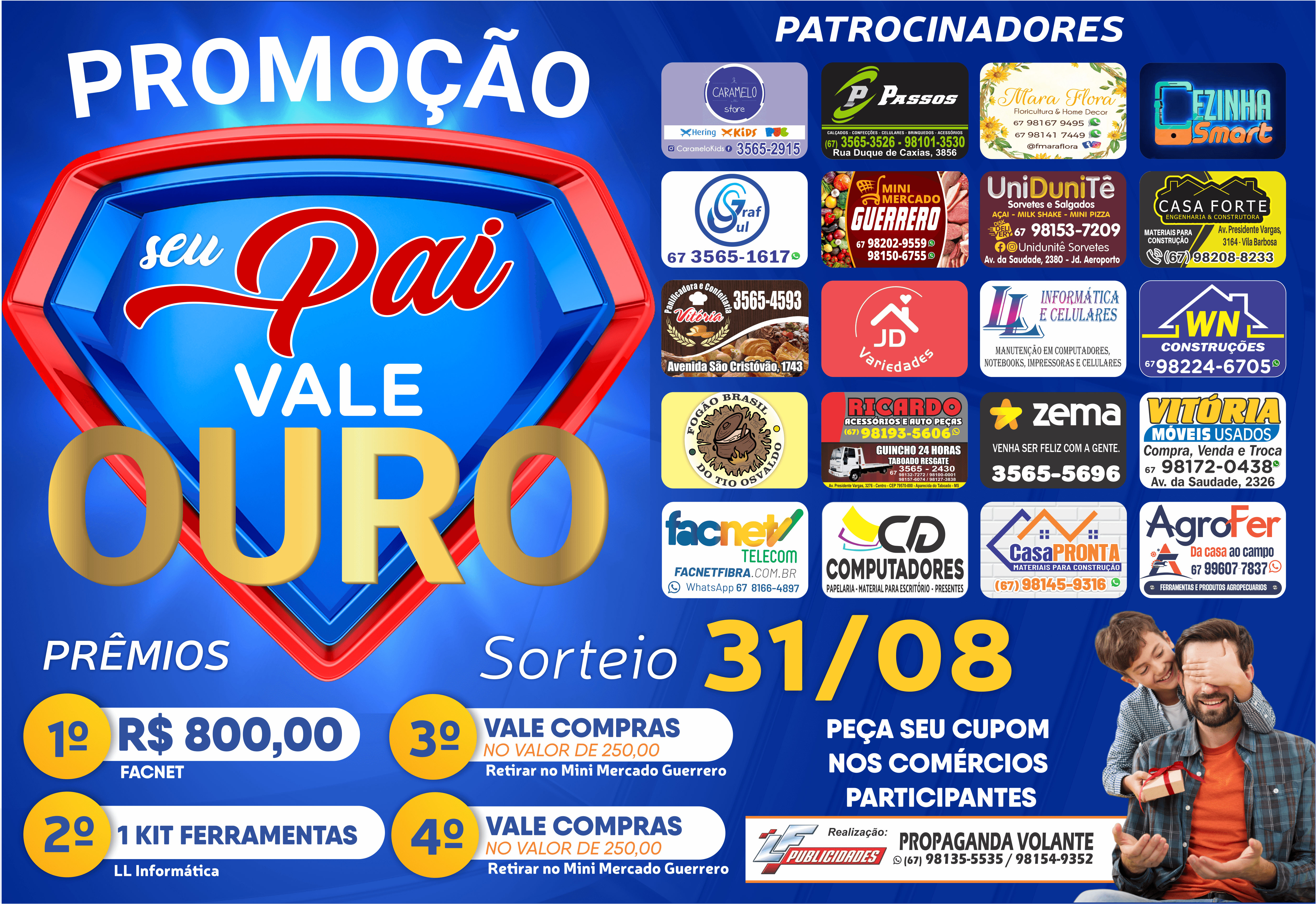 A promoção “Seu pai vale ouro” realizará o sorteio de quatro prêmios diferentes, sendo o primeiro no valor de R$800,00, o segundo um Kit Ferramentas, e os dois últimos sorteados ganharão um vale-compras no valor de R$250,00 no Mini Mercado Guerrero, cada.
