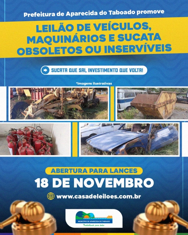 A Prefeitura de Aparecida do Taboado realizará um leilão público de veículos, maquinários e sucatas considerados obsoletos ou inservíveis. A medida é importante para a administração pública, pois permite a renovação de bens e a destinação correta de recursos para áreas essenciais, como saúde, educação e infraestrutura. Ao colocar em leilão itens sem utilidade prática para o município, a gestão também evita gastos desnecessários com manutenção e armazenamento de bens que já não atendem às necessidades operacionais.