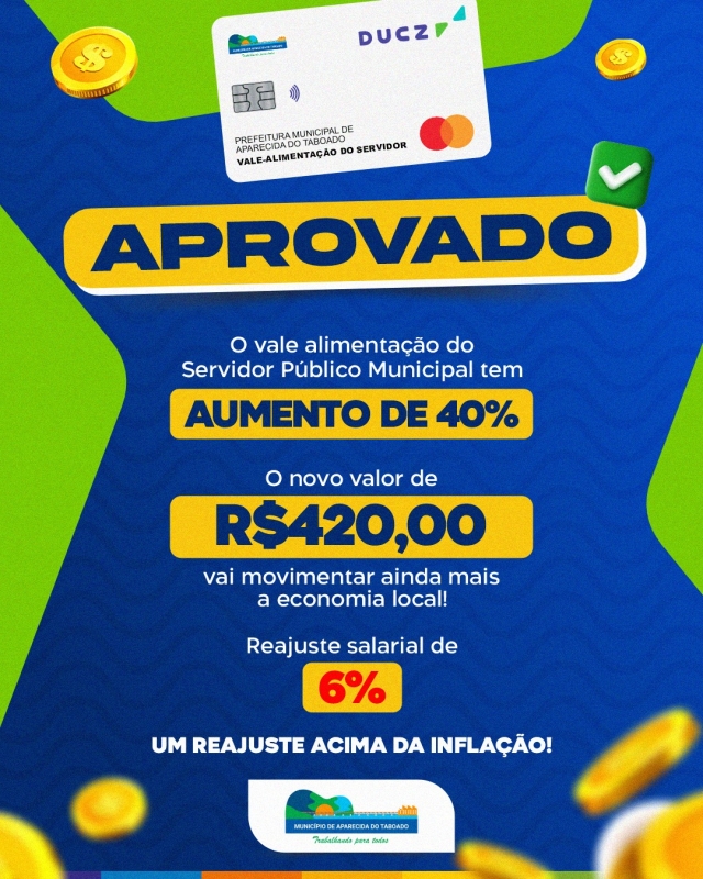 Aumento no auxílio-alimentação – Outro aumento que o governo municipal proporcionou aos servidores, foi referente ao ticket alimentação, que também foi aprovado por unanimidade pelo Legislativo, passando de R$300,00 reais mensais, para R$ 420,00, ou seja, uma elevação de 40% mensal.
