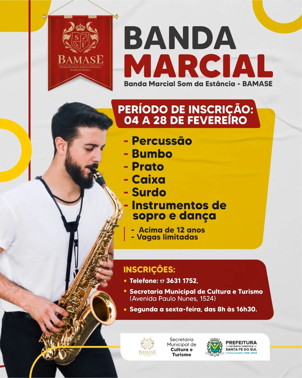A Secretaria de Cultura e Turismode Santa Fé do Sul abriu as inscrições para novos alunos da Banda Marcial Som da Estância – Bamase. As inscrições devem ser feitas de segunda a sexta-feira, das 8h às 16h30, na própria secretaria, localizada na Avenida Paulo Nunes, 1524.