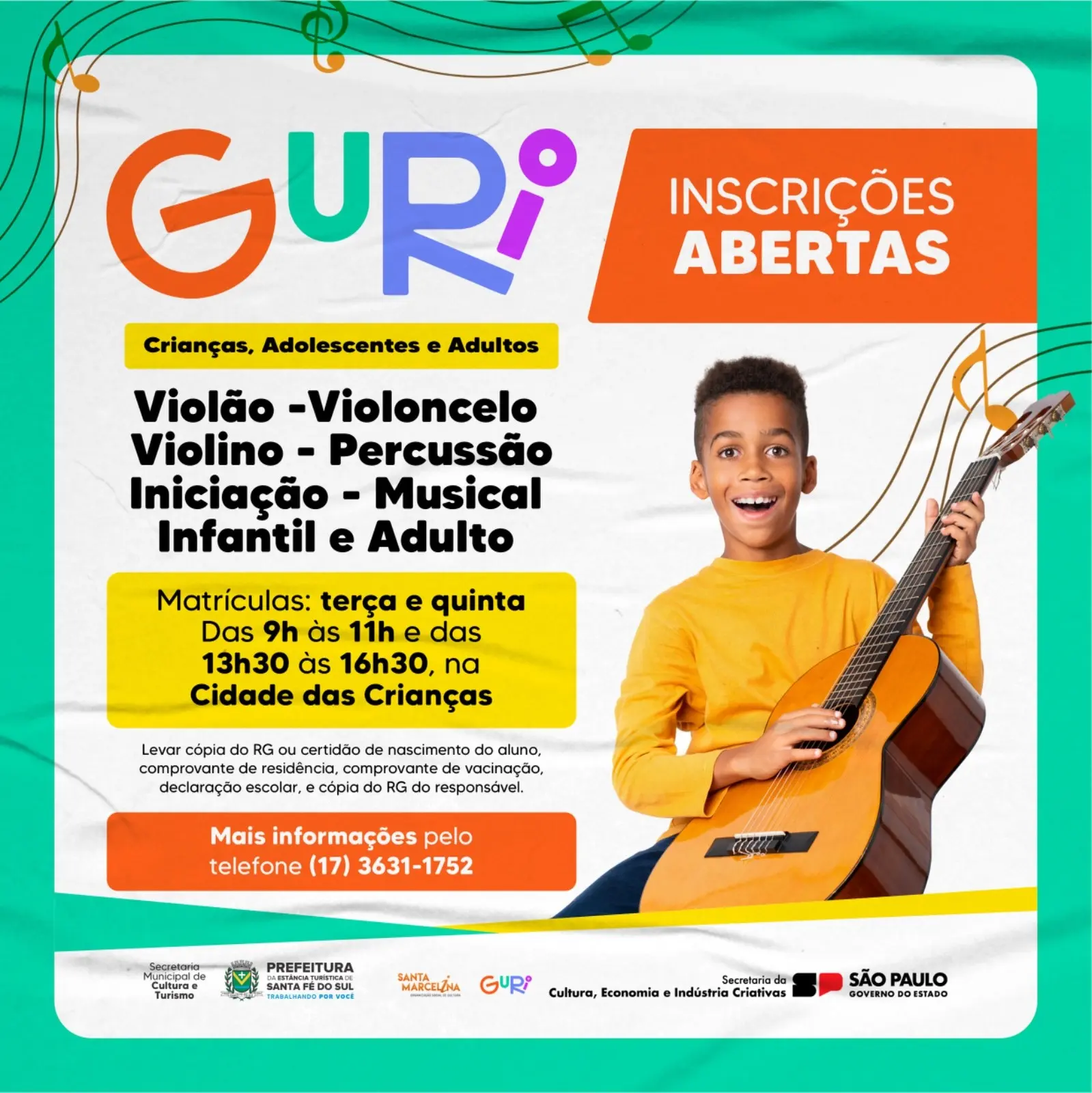 A Secretaria Municipal da Culturae Turismo da Estância Turística de Santa Fé do Sul está com matrículas abertas para o Projeto Guri. Com aulas gratuitas de música, o projeto busca promover o desenvolvimento artístico e cultural de crianças e adolescentes.