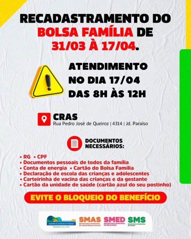 Importante comunicar que o recadastramento do programa Bolsa Família é essencial e que todos os beneficiários estejam cientes dos dados e documentos necessários para evitar qualquer interrupção no recebimento do benefício.