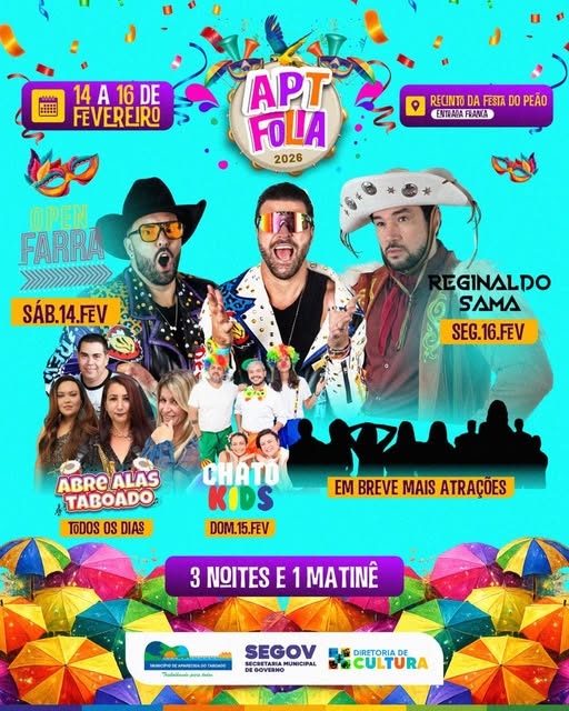 A alegria já tem data marcada para tomar conta da cidade. Entre os dias 14 e 16 de fevereiro, o Recinto da Festa do Peão de Aparecida do Taboado, será palco de muita cor, música e energia contagiante com a chegada do APT Folia 2026. O melhor, a entrada totalmente franca para todas as noites.