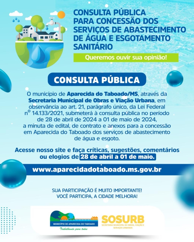 O município de Aparecida do Taboado/MS, através da Secretaria Municipal de Obras e Viação Urbana, em observância ao art. 21, parágrafo único, da Lei Federal nº 14.133/2021, submeterá à consulta pública no período de 28 de março de 2024 a 01 de maio de 2024, a minuta de edital, de contrato e anexos para a Concessão dos Serviços de Abastecimento de Água e Esgoto em Aparecida do Taboado – MS.