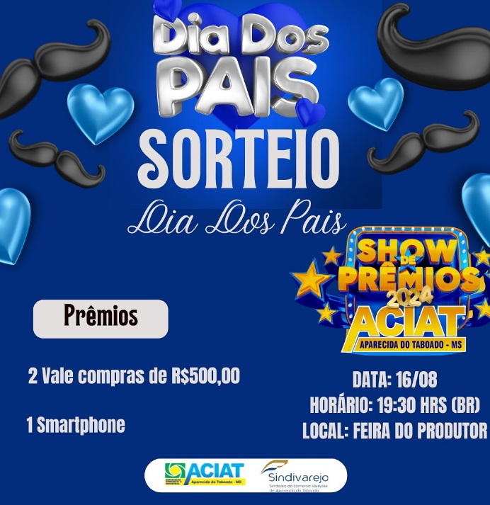 Aparecida do Taboado (MS) – Acontecerá na sexta-feira (16) o sorteio do Dia dos Pais, na Feira do Produtor, realizado pela Associação Comercial (ACIAT) em parceria com o Sindivarejo.