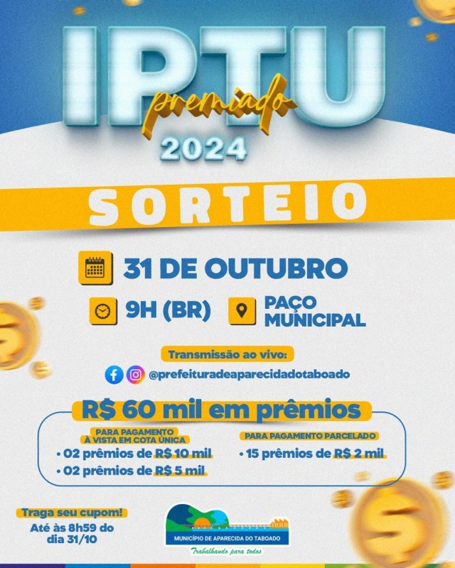 O Governo Municipal de Aparecida do Taboado realizará na manhã de 31 de outubro, o sorteio de R$ 60 mil em prêmios pela campanha “IPTU Premiado 2024 – O IPTU que a gente vê”.