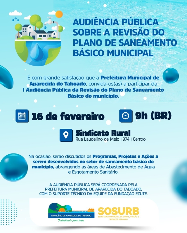 O Governo Municipal de Aparecida do Taboado está organizando a I Audiência Pública da Revisão do Plano de Saneamento Básico do município, agendada para amanhã, dia 16 de fevereiro. O evento terá início às 9h (horário de Brasília) no centro de eventos do Sindicato Rural de Aparecida do Taboado.