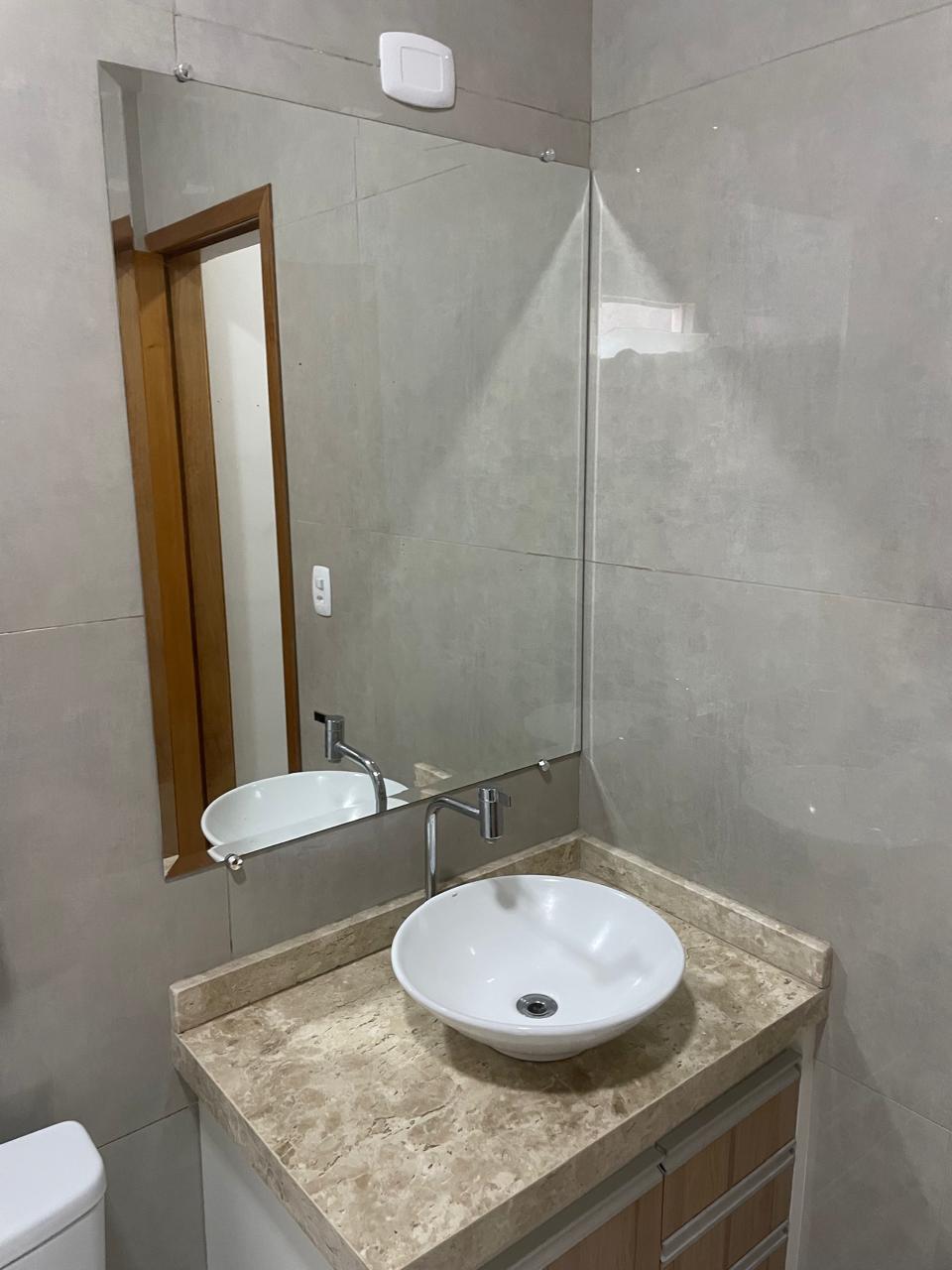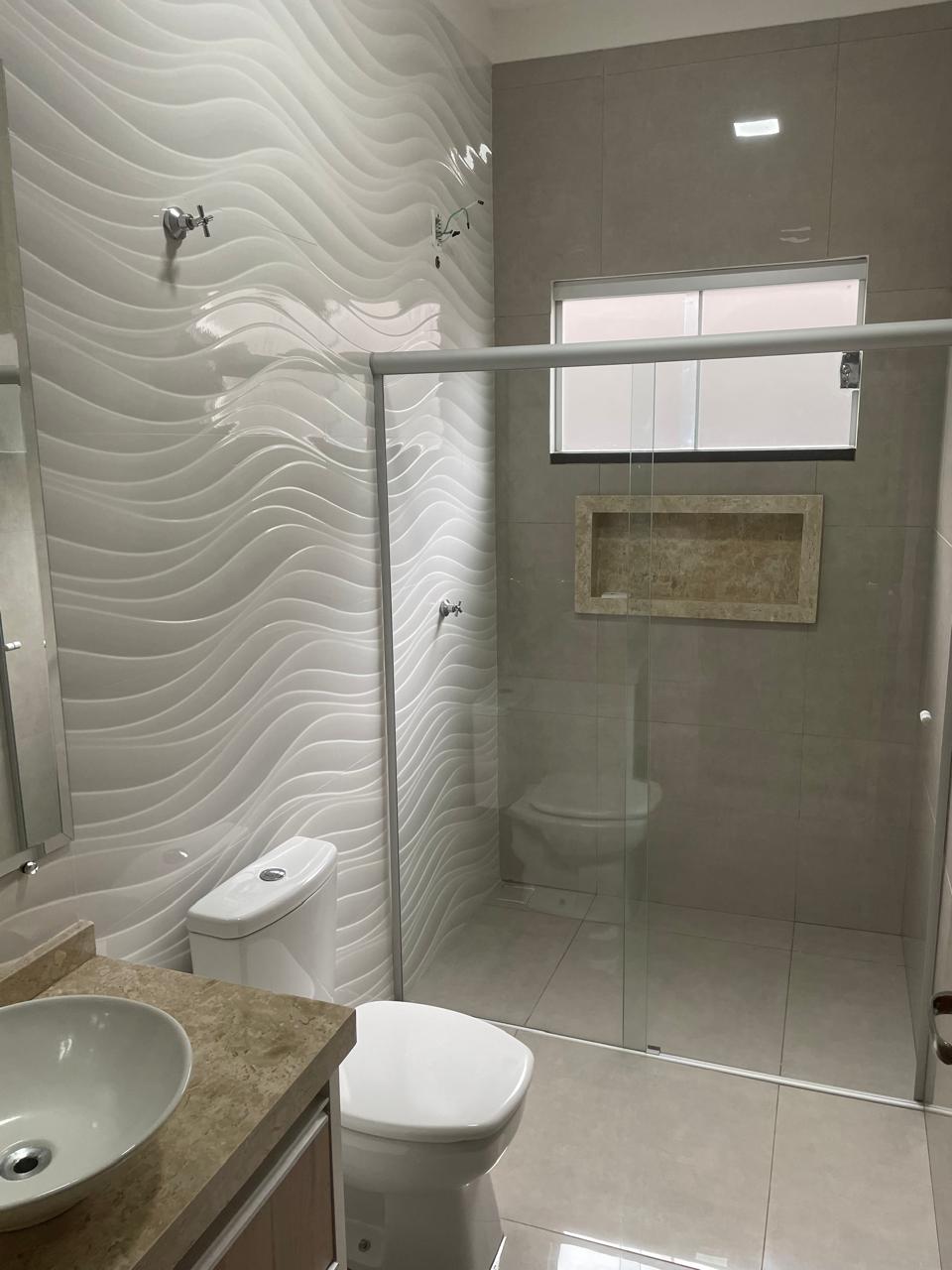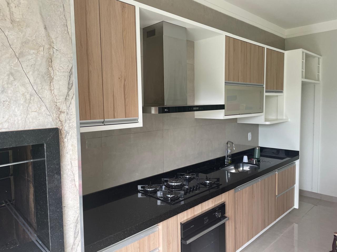 É uma suite com closet + dois quartos (3 no total), um banheiro social e mais um lavabo, área gourmet, garagem coberta p/ 2 carros