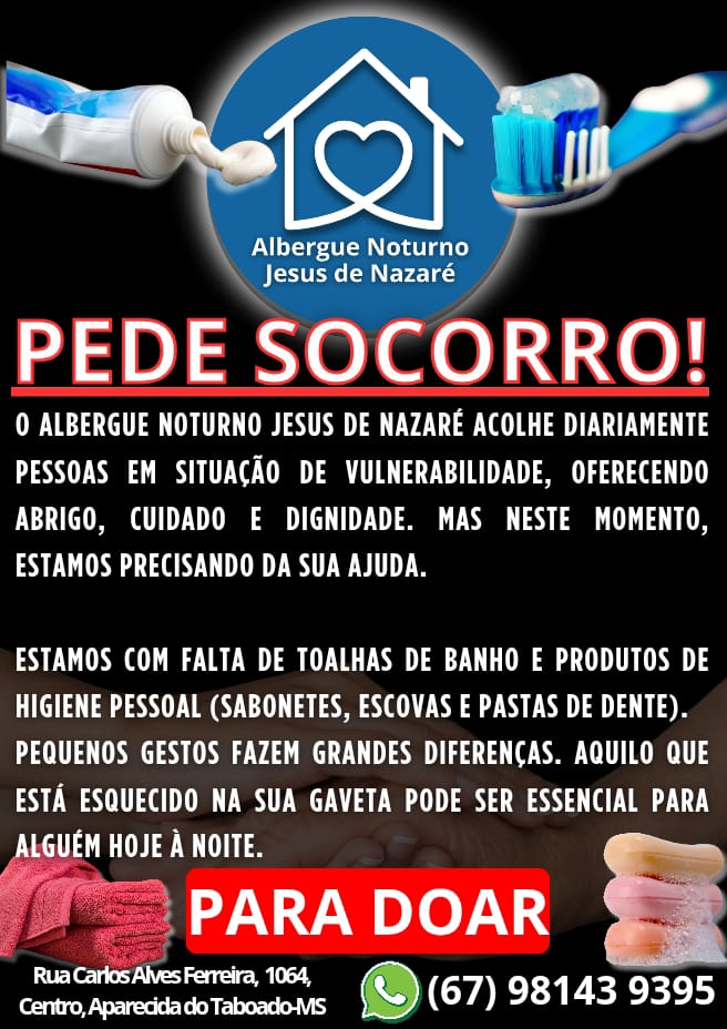 Aparecida do Taboado (MS) – Com capacidade atual para acolher até 10 pessoas em contexto de desigualdade social, o Albergue Noturno Jesus de Nazaré enfrenta dificuldades para manter os atendimentos e lançou uma campanha de arrecadação de toalhas de banho, produtos de higiene pessoal e outros itens de necessidade básica. A unidade é presidida por Priscila Ferreira Sabatini, que reforça o apelo à comunidade local por apoio solidário.