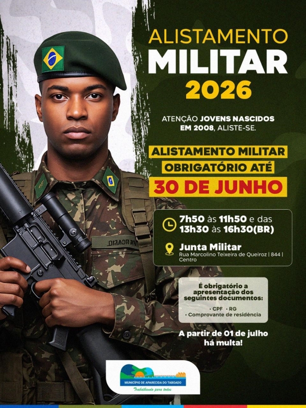 A Junta de Serviço Militar informa que está aberto o alistamento militar obrigatório 2026, destinado aos jovens do sexo masculino nascidos em 2008.