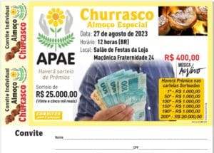 Aparecida do Taboado (MS) – A Associação de Pais e Amigos dos Excepcionais (APAE) realizará no dia 27 de agosto, um almoço especial com churrasco que sorteará R$25 mil.