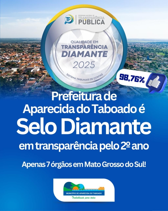 Para o controlador-geral do município, Weliton Marques, a manutenção do Selo Diamante simboliza a maturidade e o fortalecimento das práticas de transparência adotadas pelo Executivo municipal. “Conquistar novamente o Selo Diamante mostra que a cidade avançou, consolidou processos e transformou a transparência em rotina. É resultado de um trabalho técnico, contínuo e comprometido, que coloca Aparecida do Taboado entre os órgãos mais bem avaliados do Estado”, destacou.