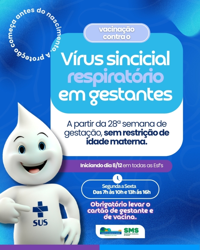 A Prefeitura de Aparecida do Taboado iniciou nesta segunda-feira, 8 de dezembro, a aplicação da nova vacina contra o Vírus Sincicial Respiratório (VSR), principal responsável pelos casos de bronquiolite em bebês. O imunizante, enviado pelo Ministério da Saúde, faz parte da estratégia nacional de proteção antecipada dos recém-nascidos por meio da imunização materna.