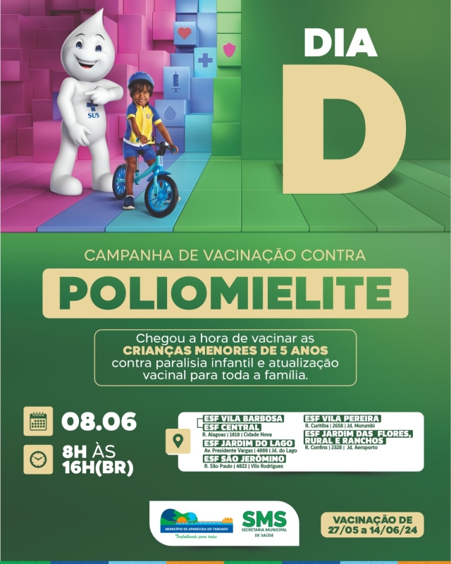 Aparecida do Taboado (MS) – Acontecerá neste sábado (08) o “Dia D” de vacinação contra a Poliomielite e atualização da carteira de vacinação em todas as Unidades Básicas de Saúde do município.