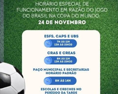 MaisA Administração Municipal em dias de jogos da Copa, terá horário especial de funcionamento. Em razão da estreia neste dia 24 de novembro, às 16 horas, quando o Brasil entra em campo