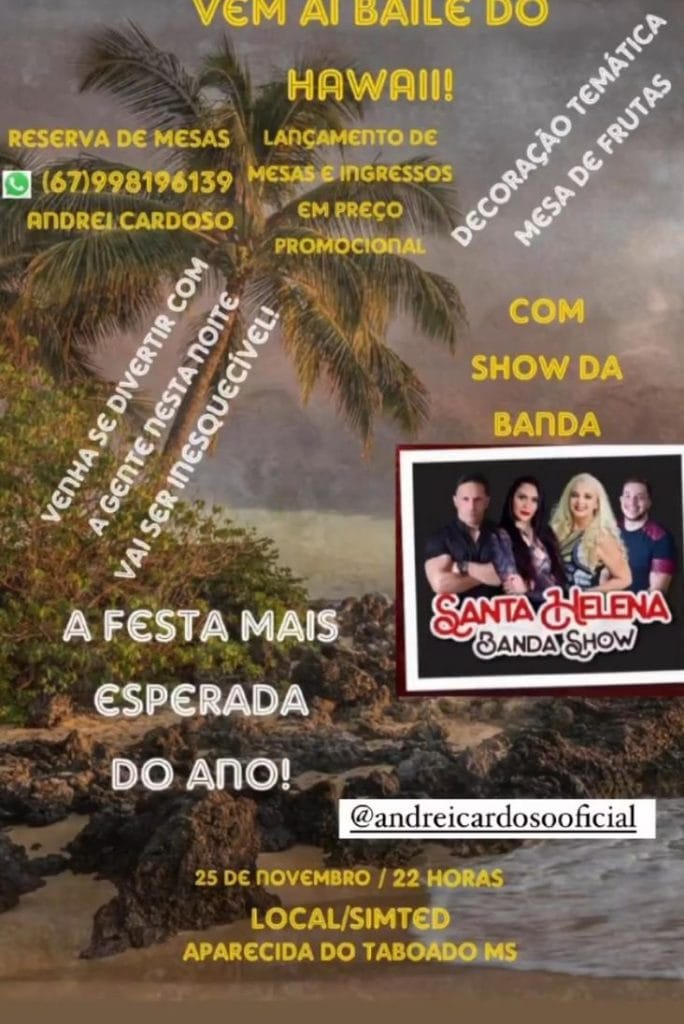 Aparecida do Taboado (MS) – No dia 25 de novembro, será realizado o primeiro “Baile do Hawaí” organizado por Andrei Cardoso e família. Andrei já possui experiência em planejar forrós, agora se desafia para garantir um ótimo baile no município.
