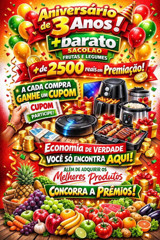 As regras da promoção, datas e demais detalhes da campanha ainda serão divulgados oficialmente pela empresa nos próximos dias. A orientação é para que os interessados acompanhem as atualizações pelas redes sociais do estabelecimento, onde todas as informações sobre o sorteio serão anunciadas. Acompanhe o perfil no Instagram @barato_sacolao.