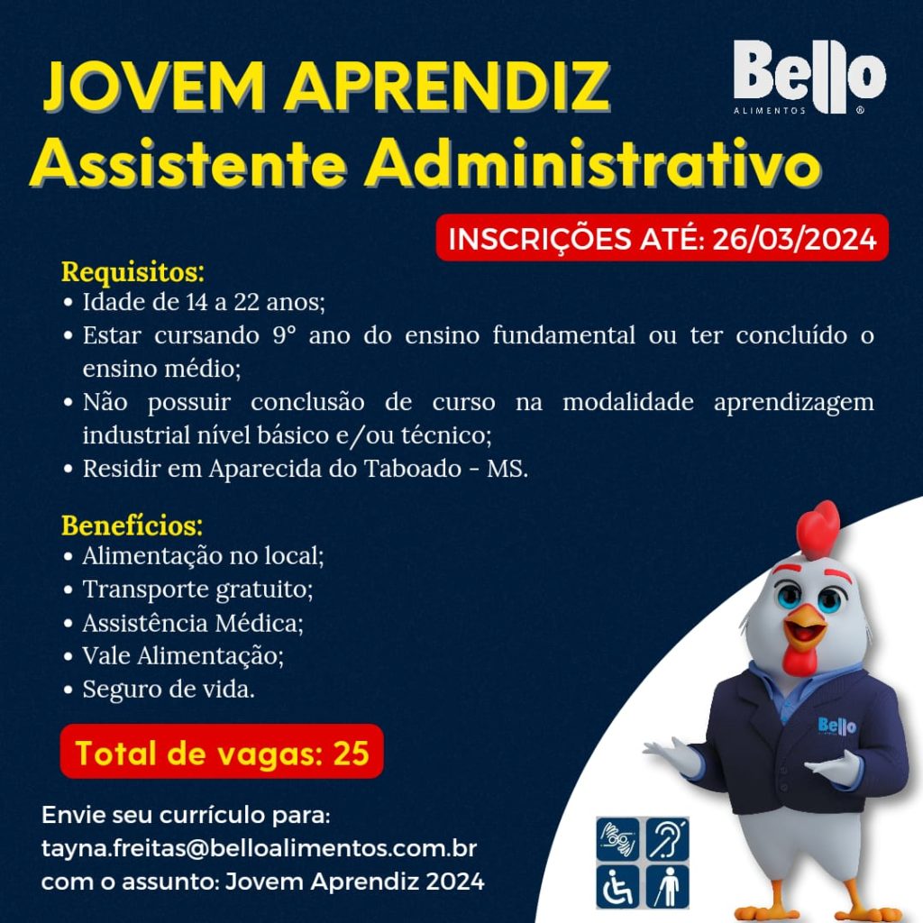 Aparecida do Taboado (MS) – Estão abertas as inscrições para o programa Jovem Aprendiz na Bello Alimentos que está oferecendo 48 vagas no total. Os interessados têm até o dia 26 de março para realizar as inscrições.