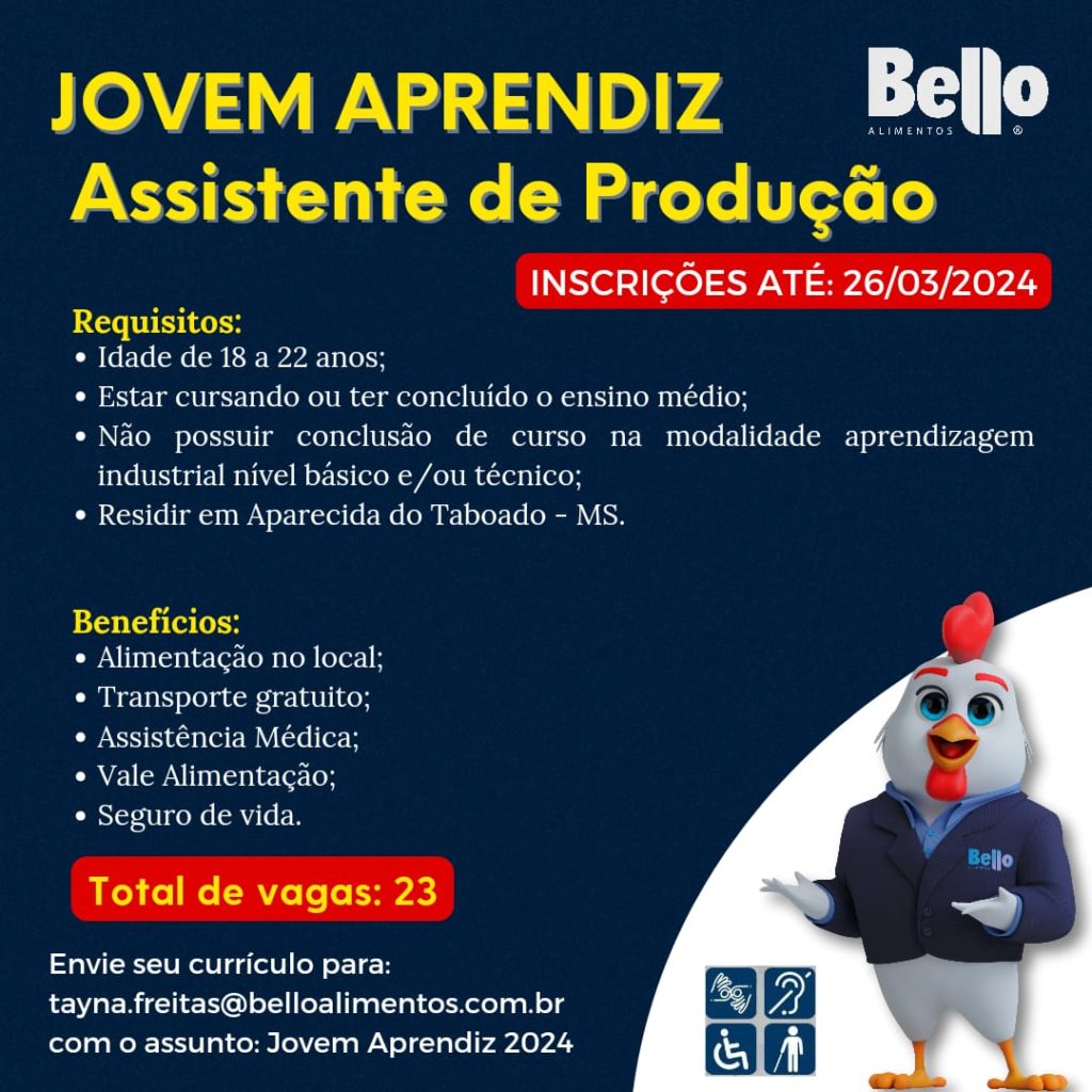 Aparecida do Taboado (MS) – Estão abertas as inscrições para o programa Jovem Aprendiz na Bello Alimentos que está oferecendo 48 vagas no total. Os interessados têm até o dia 26 de março para realizar as inscrições.