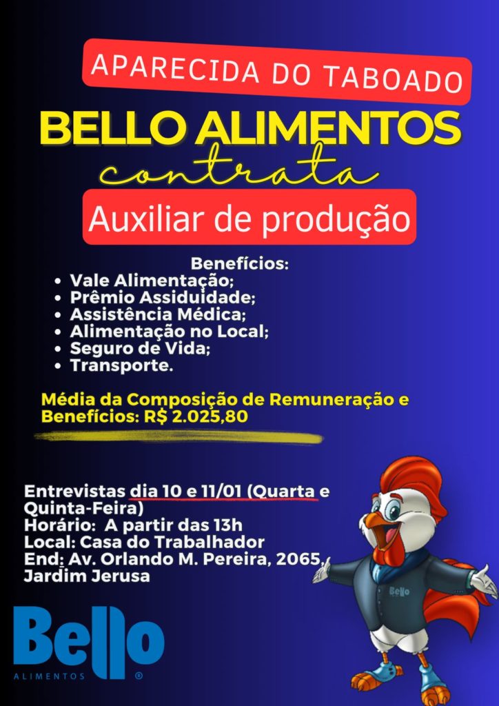 Aparecida do Taboado (MS) – Os interessados em trabalhar como auxiliar de produção na Bello Alimentos poderão participar do último dia de mutirão de vagas promovido pela empresa nesta quinta-feira (11) a partir das 13h. O mutirão acontece na Casa do Trabalhador que está localizado na Av. Orlando Mascarenhas Pereira, 2065, em frente ao Fórum.