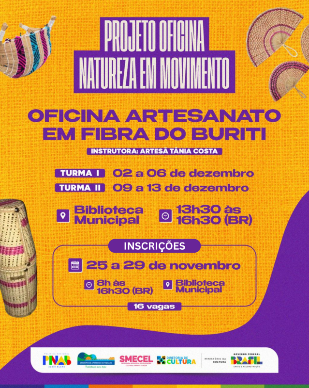 Voltado para a arte com elementos naturais, esta oficina ensina a confecção de peças utilizando fibras de buriti, um material sustentável e natural. Sob a orientação da artesã Tânia Costa, os participantes aprenderão a transformar matérias-primas locais em belas peças artesanais.