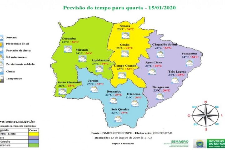 MaisO tempo segue instável nesta terça-feira (14.01) em Mato Grosso do Sul. Previsão do Instituto Nacional de Meteorologia (Inmet) indica condições de céu nublado a parcialmente nublado com pancadas de chuva e