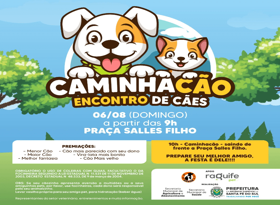 No próximo domingo, 6 de Agosto, acontecerá na Estância Turística de Santa Fé do Sul o evento CaminhaCão – Encontro de Cães, realizado pela Prefeitura Municipal, por meio das Secretarias Municipais de Agricultura, Abastecimento e Meio Ambiente e de Saúde, em parceria com o Gavas, a Raguife e a Guarda Civil Municipal. Será na Praça Salles Filho, a partir das 9h.
