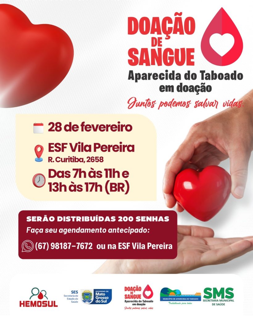 Aparecida do Taboado (MS) – Em razão do baixo estoque de bolsas de sangue no Hemosul, acontecerá no dia 28 de fevereiro uma campanha de Doação de Sangue no ESF Vila Pereira.
