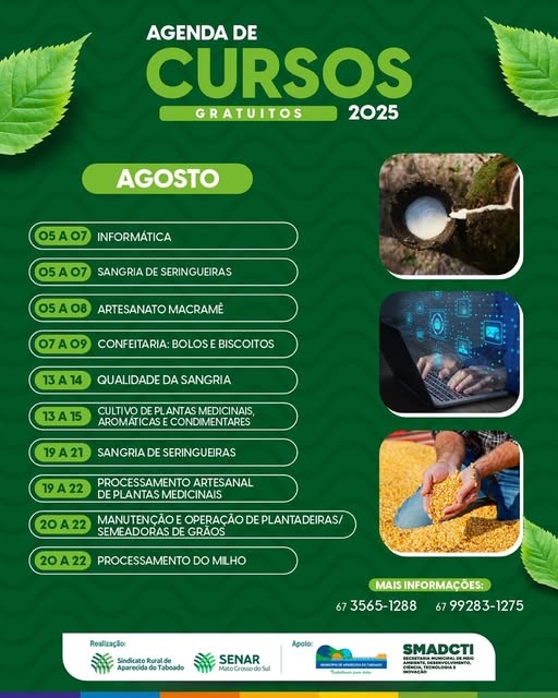 Aparecida do Taboado (MS) – Com dez cursos disponíveis para o mês de agosto, o Sindicato Rural divulgou a agenda dos cursos gratuitos realizados em parceria com o Senar MS e apoio da Prefeitura Municipal e da Secretaria de Meio Ambiente, Desenvolvimento, Ciência, Tecnologia e Informação.