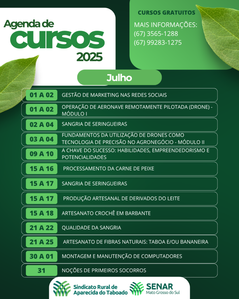 Aparecida do Taboado (MS) – Com treze cursos disponíveis para o mês de julho, o Sindicato Rural divulgou a agenda dos cursos gratuitos realizados em parceria com o Senar MS e apoio da Prefeitura Municipal e da Secretaria de Meio Ambiente, Desenvolvimento, Ciência, Tecnologia e Informação.