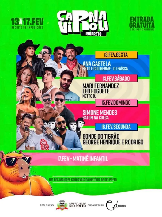 A Prefeitura de Rio Preto anunciou no ultimo sábado (24), por meio do perfil oficial no Instagram, a realização do Carnavirou, carnaval oficial da cidade em 2026. O evento acontecerá entre os dias 13 e 17 de fevereiro e já teve a programação completa divulgada, reunindo nomes de destaque da música nacional.