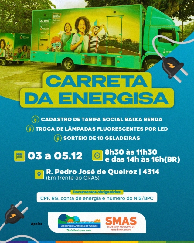 A carreta da ENERGISA está presente em Aparecida do Taboado para realizar o cadastramento da Tarifa Social de baixa renda; e a troca gratuita de lâmpadas incandescentes ou fluorescentes por lâmpadas de LED.