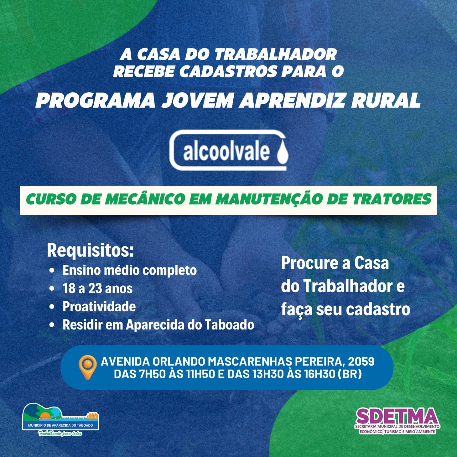 Através do Programa Jovem Aprendiz Rural, a Casa do Trabalhador está recebendo cadastros de jovens, para o curso de mecânico em manutenção de tratores.