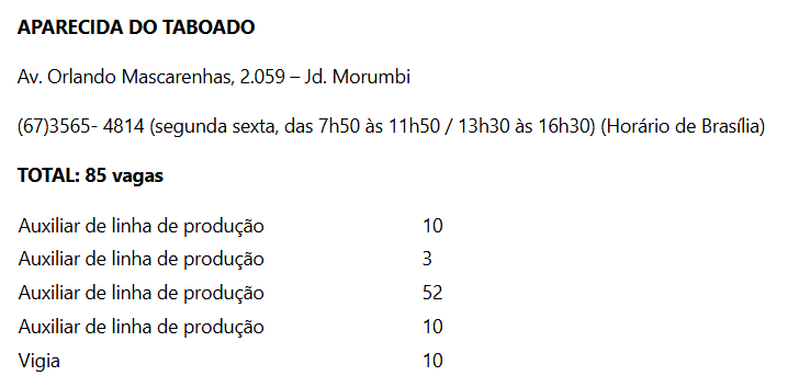 A Casa do Trabalhador de Aparecida do Taboado atualmente conta com 85 vagas de emprego disponíveis para serem preenchidas, de acordo com o site da FUNTRAB. As vagas são variadas e destinadas para candidatos com ensino médio completo, ensino superior e experiência na área.