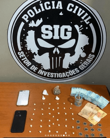 Durante busca minuciosa, foram encontradas 39 porções de crack, totalizando aproximadamente 7,3g, um invólucro plástico contendo cocaína (ainda a ser misturada com outras substâncias, fracionada e embalada para venda), duas porções de cocaína pesando 6,4g, uma porção de maconha pesando 16,8g, além de R$ 1.102,00 em dinheiro, e dois aparelhos de telefone celular.