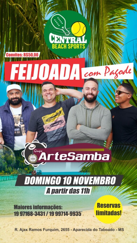 Aparecida do Taboado (MS) – A dica para quem procura uma programação diferente para este final de semana é a “Feijoada com Pagode” promovido pela Central Beach Sports neste domingo, dia 10.