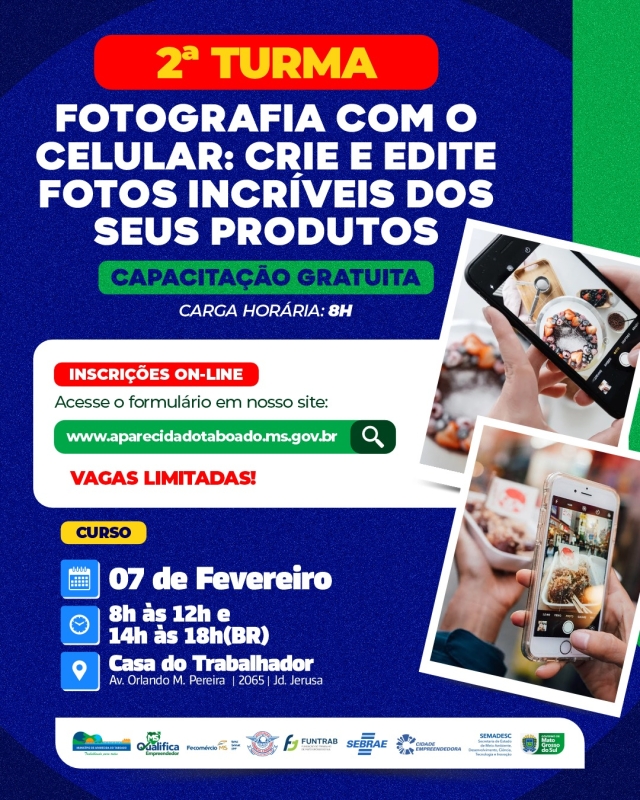 Através do Programa Cidade Empreendedora, a Prefeitura Municipal e o Sebrae, promovem a segunda turma do curso gratuito de fotografia com celular para os aparecidenses. Esta é uma oportunidade única para aprender a criar e editar fotos incríveis dos seus produtos, tudo isso de forma totalmente gratuita. O curso é destinado para profissionais autônomos, empreendedores e comerciantes que desejam aprender a divulgar de maneira profissional os seus produtos.