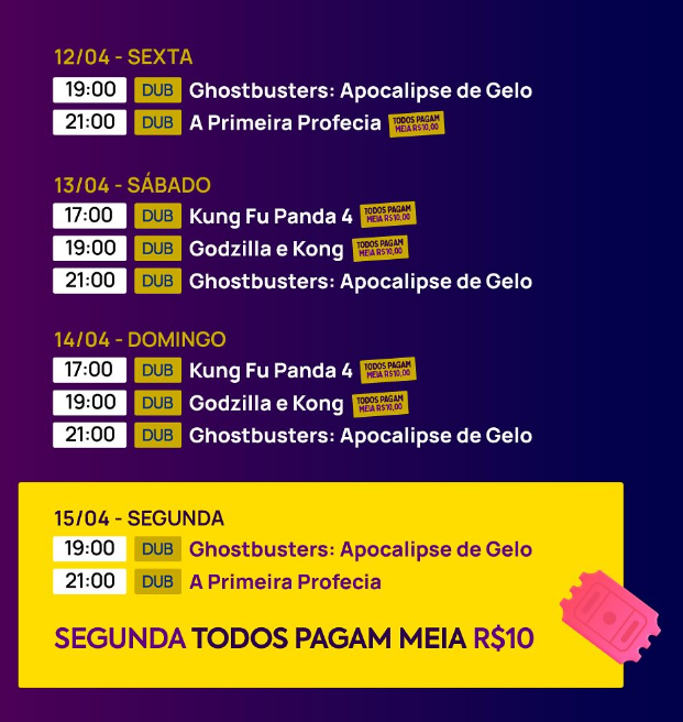 Santa Fé do Sul (SP) – A partir desta sexta-feira (12), o Cinema Santa Fé do Sul iniciará a programação do fim de semana com quatro filmes em cartaz. O filme “Ghostbusters: Apocalipse de Gelo” será a estreia da semana e os filmes A Primeira Profecia, Godzilla e Kong e Kung Fu Panda 4 também continuarão disponíveis.
