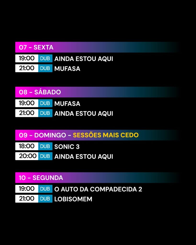 Durante este período, estarão disponíveis os filmes: Ainda Estou Aqui, Lobisomem, O Auto da Compadecida 2, Sonic 3 e Mufasa.