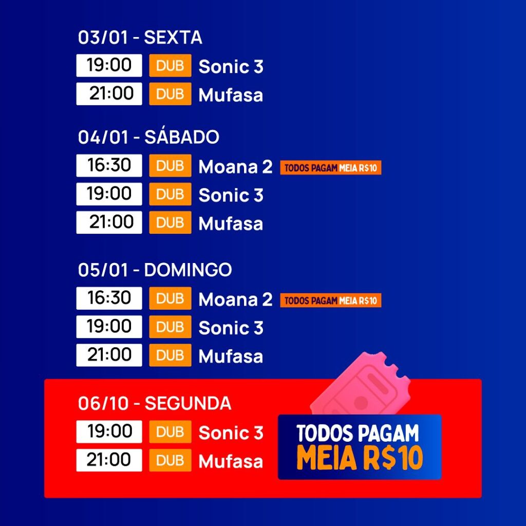 Santa Fé do Sul (SP) – Entre os dias 03 e 06 de janeiro, o Cinema Santa Fé do Sul terá três filmes em sua programação. Estarão em cartaz os filmes Sonic 3, Mufasa: O Rei Leão e Moana 2 com preço especial no valor dos ingressos.