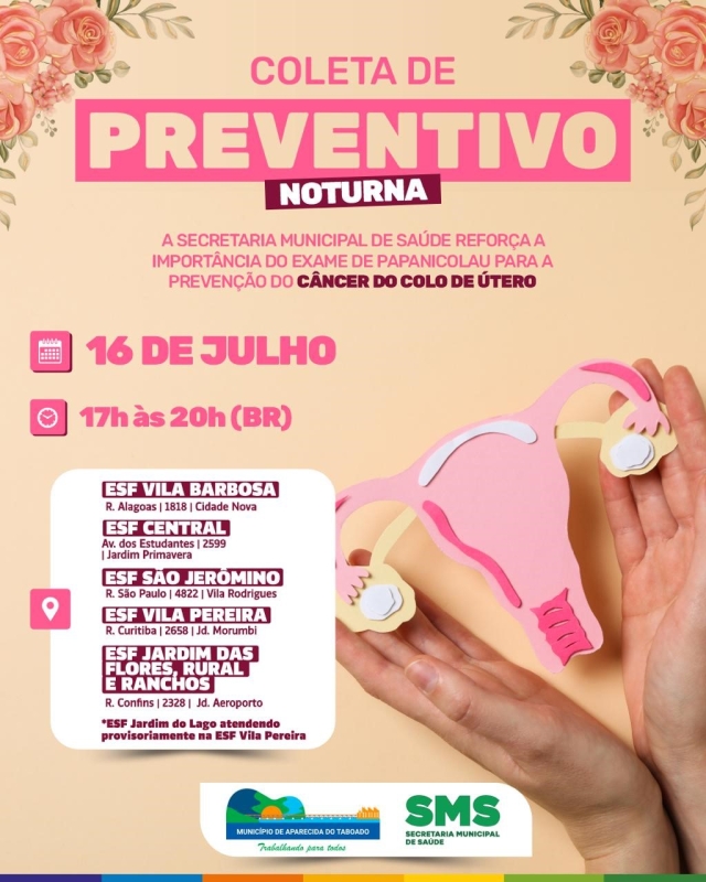 A Secretaria Municipal de Saúde de Aparecida do Taboado realiza, nesta quarta-feira (16 de julho), das 17h às 20h, a coleta noturna de exame preventivo (Papanicolau) em diversas unidades de saúde do município. A ação tem como objetivo ampliar o acesso das mulheres ao exame, especialmente daquelas que não conseguem comparecer durante o horário comercial.